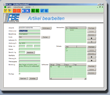 Das Unternehmen Feinblechverarbeitung Eschenburg (FBE) stellt Metallprodukte in zahlreichen Verfahren her: Stanzen, Biegen, Lasern etc. Zur Modernisierung der Auftragsbearbeitung wurde ein datenbankbasiertes System entwickelt: Verwaltung von Artikeln, Mitarbeitern,